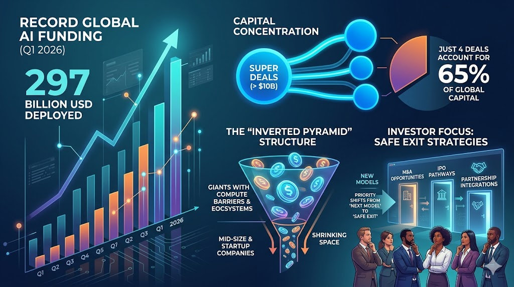 - 融资高峰: 2026 年第一季度全球 AI 领域部署资金达 2970 亿美元,打破历史记录。