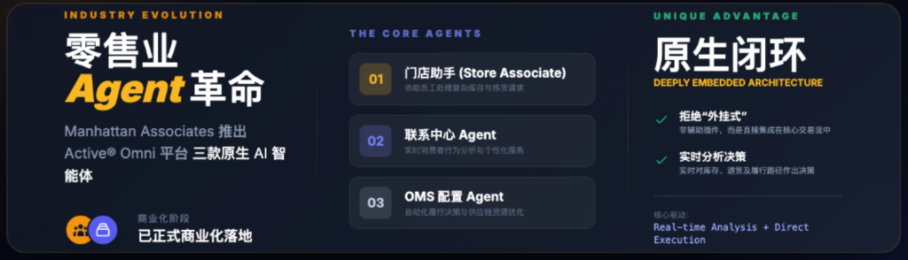 零售业正在告别“仪表盘时代”。过去的管理者看数据报表做决策,现在的 Agent 直接在交易发生时修正流程。久湛认为,这种“AI 原生(AI-Native)”的供应链应用预示着未来企业软件的形态:不再有独立的 AI 菜单,AI 必须活在业务流程的血脉里,实现“所见即所处理”。 - 关键词: 零售 AI、供应链 Agent、Manhattan Associates、原生 AI 应用