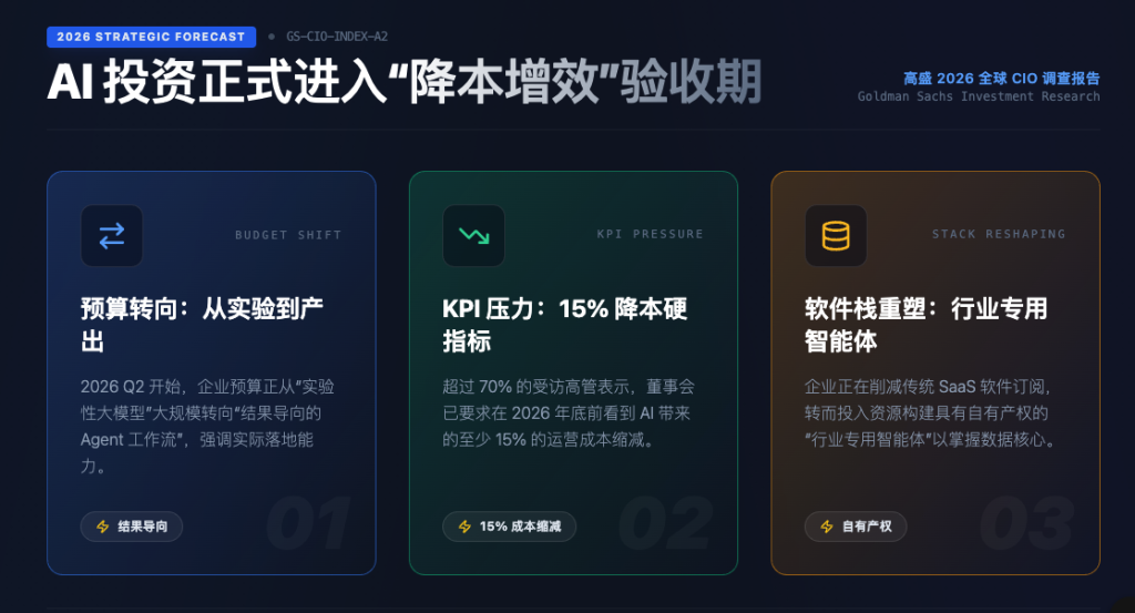 - 预算转向: 高盛对全球 500 强企业的 CIO 调查显示,2026 年 Q2 开始,资金正从“实验性大模型”大规模转向“结果导向的 Agent 工作流”。