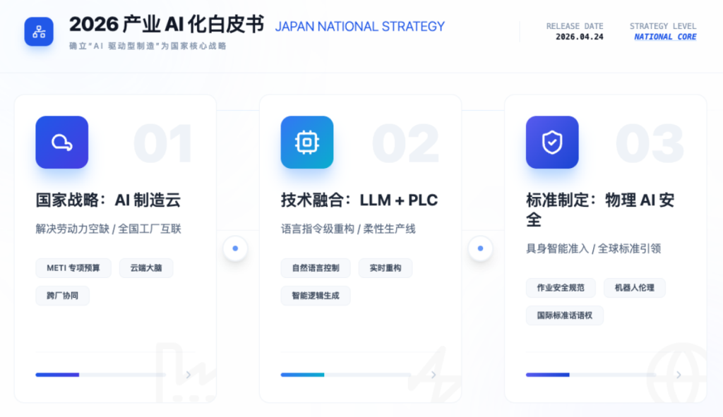 - 标准制定: 日本正推动建立“物理 AI 安全标准”,为全球具身智能机器人进入工厂作业制定准入规范。
