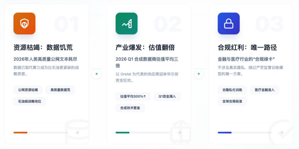- 合成数据崛起: 以“Gretel”和“Synthesis AI”为代表的高质量合成数据供应商,在 2026 年 Q1 的估值平均翻了三倍。