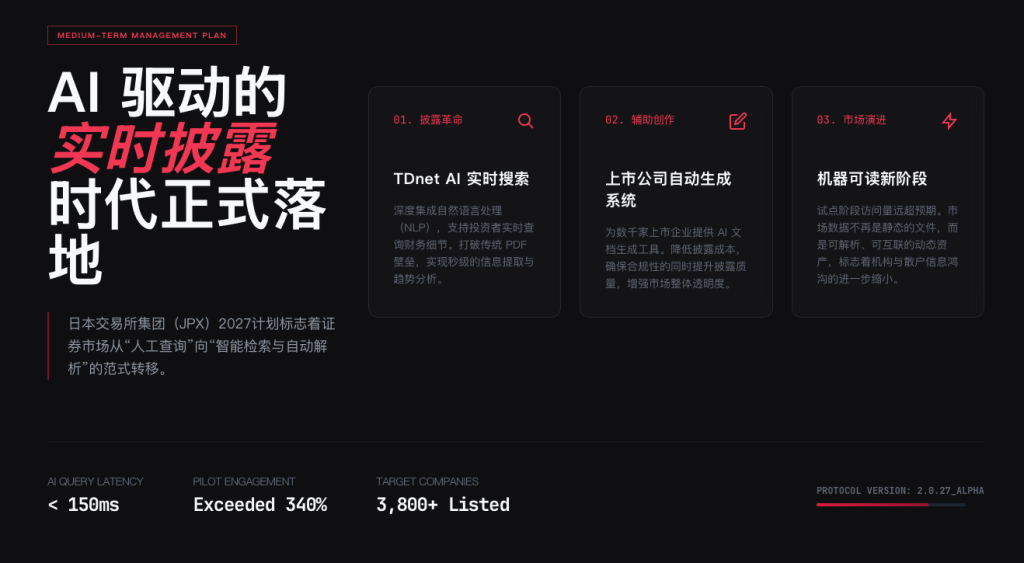 披露革命: JPX 宣布在其 2027 中期管理计划中,将 AI 实时搜索与分析功能正式嵌入 TDnet(披露文件网络),支持自然语言实时查询上市公司的财务披露。